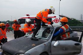 – Simulasi tim SAR saat berusaha menyelamatkan korban kecelakaan yang terjebak di dalam mobil.