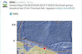Gempa berkekuatan 4,0 Skala Richter (SR) mengguncang Timur Laut Kabupaten Jayapura, Papua pada Senin (28/7/2014) sekitar pukul 11.21 WIT.