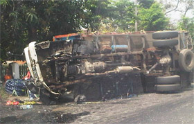 2. Truk colt diesel bermuatan ban yang terguling.