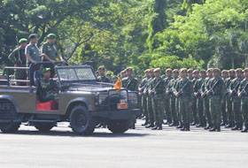 Berkesempatan melakukan inspeksi pasukan bersama Mayjend TNI Edhiwan Prabowo, pejabat Panglima Daerah Militer (Pangdam) V Brawijaya yang baru sesekali tersenyum menyaksikan deretan pasukan dan para petinggi TNI dan Polri.