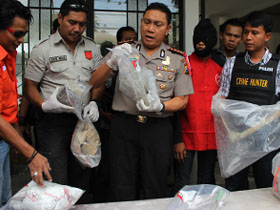 – Kombes Pol Setija Junianta Kapolrestabes Surabaya menunjukkan barang bukti pembunuhan di komplek perumahan Jl. Dharmahusada Indah I Blok B, Surabaya nomor 154.