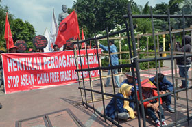 Menampilkan aksi teaktrikal, beberapa orang dengan atribut masing-masing, mulai dari petani, pengusaha serta mahasiswa, terkurung dalam kerangkeng dengan pengamanan ketat, sebagai simbolisasi betapa rakyat akan menderita dengan dibukanya ASEAN – CHINA Free Trade Agreement (ACFTA).