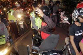 Teks Foto: Polisi memeriksa seorang pengendara motor dalam Operasi Cipta Kondisi.