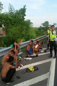 PJR Tol Jatim 2 mengamankan mobil Suzuki Ertiga bernopol N 1031 GY bersama pengemudi dan tujuh penumpangnya di ruas Tol Waru-Perak KM 12.800, Rabu (9/12/2015) sekitar pukul 06.27 WIB.