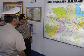 2. Irjen Pol Anas Yusuf Kapolda Jatim (tengah) melihat Peta titik kemacetan arus mudik Lebaran.