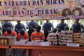 Selain narkoba, polisi dan Pemerintah Kota Surabaya juga memusnahkan ratusan minuman keras oplosan yang berhasil diungkap Polres Pelabuhan Tanjung Perak Surabaya.