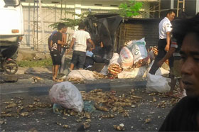 -. Muatan pick up berserakan di jalan akibat ditabrak truk trailer.