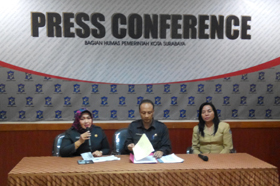 – Suharto Wardoyo, Kadispendukcapil Kota Surabaya (tengah) bersama Hindun, Camat Semampir (kiri), dan Dayu Kasubbag Layanan Informasi Pemkot Surabaya saat mengklarifikasi satu WNI Surabaya di Pemkot Surabaya, Selasa (17/3/2015).