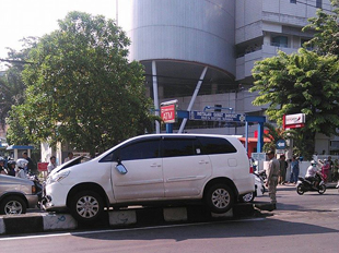 – Mobil Innova yang terlibat kecelakaan di jalan Dharmawangsa naik ke pembatas jalan