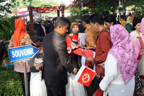 – Kesibukan di meja penukaran souvenir dalam Upacara Penurunan Bendera di Istana Merdeka. Foto: Setpres.