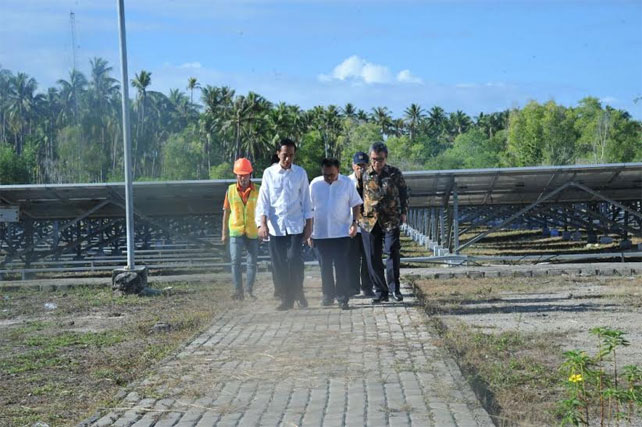 Joko Widodo Presiden dan Iriana Joko Widodo Ibu Negara mengunjungi Pembangkit Listrik Tenaga Surya (PLTS) Daruba di Desa Juanga, Morotai Selatan, Rabu (6/4/2016) pagi. Kunjungan ini di luar agenda yang telah dijadwalkan.