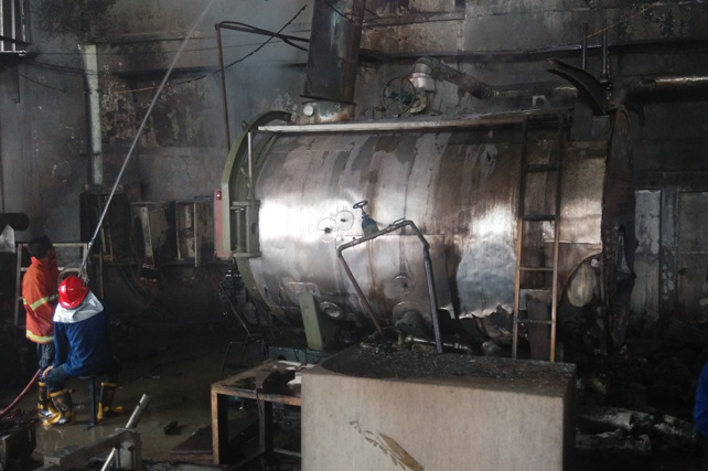 Petugas pemadam kebakaran melakukan pembasahan pada mesin boiler di PT Pandaria Makmur, Senin (18/1/2016). Foto: Bruriy suarasurabaya.net