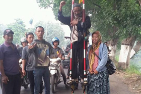 – Mbah Yudi pejalan egrang saat diajak groufie dengan pengguna jalan di Sidorejo Krian. Foto: Aris Harijanto ‏@Pascalish3 via e100ss