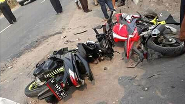 “Pas di galangan pasir belakang Polsek, 500 meter dari traffic light, korban memotong jalur ke kanan karena mau belok ke gang. Dari arah sebaliknya ada sepeda motor CBR W 6155 NG yang melaju dengan kecepatan tinggi. Akhirnya tabrakan,” kata Aiptu Sugeng kepada Radio Suara Surabaya, Sabtu sore.