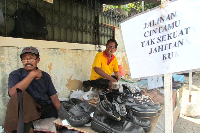 Memiliki jargon Jalinan Cintamu Tak Sekuat Jahitanku, membuat duo tukang jahit sol sepatu ini banyak menarik pelanggan. Hampir setiap hari ada saja orang yang datang untuk order agar sepatu atau sandalnya yang rusak diperbaiki di sini.