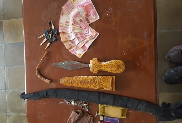 Saat dibuka, lanjut dia, sabuk jimat itu berisi kertas mantra, satu lempeng besi kuning, dua buah cincin batu akik, sebatang bambu kuning dan seuntai kalung perak. Dari pengakuannya, pelaku mendapatkan jimat itu dari seseorang di Madura. Harapannya, jimat itu bisa memberikan kekuatan atau kekebalan pada dirinya, apabila aksinya gagal dan terancam dihajar massa.