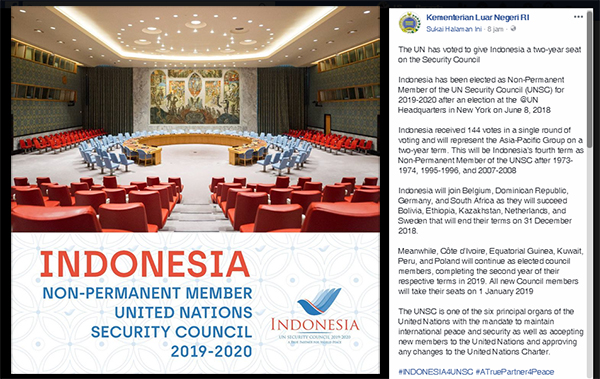 “Alhamdulilah di dalam Majelis Umum PBB, Indonesia terpilih sebagai anggota tidak tetap Dewan Keamanan PBB mewakili kawasan Asia-Pasifik menggantikan Kazakhstan yang masa keanggotaannya akan berakhir pada akhir 2018,” kata Retno Marsudi Menteri Luar Negeri RI melalui konferensi video langsung yang dilansir Antara, Jumat (9/6/2018).