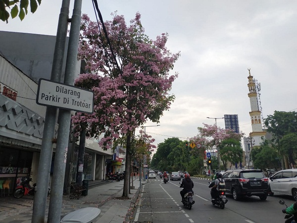 Bunga Tabebuya yang bermekaran di Jalan Mayjend Sungkono. Foto: Abidin suarasurabaya.net