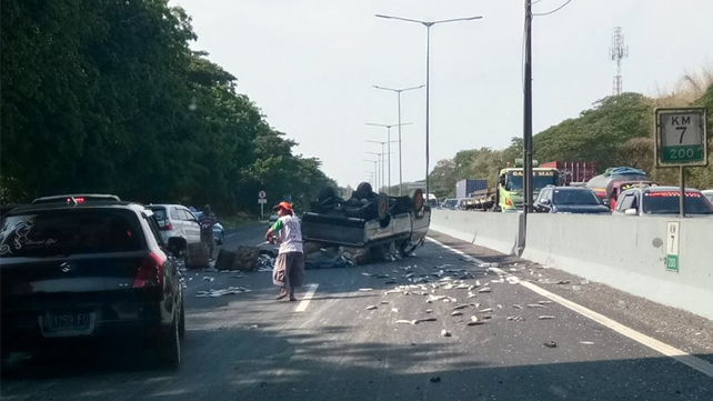 Mobil pick up bermuatan ikan segar, terbalik di KM 7200 Tol Gunung Sari arah Perak, Minggu (14/10/2018) sekitar pukul 14.10 WIB.