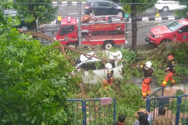 24. Jalan KH Mansyur ke arah Al Irsyad, pohon tumbang menimpa mobil Nissan Elgrand yang sedang parkir.