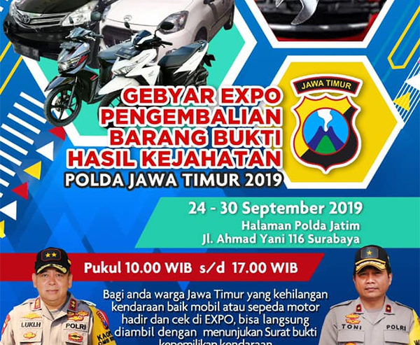 Gebyar Expo Pengembalian Barang Bukti Hasil Kejahatan akan digelar Selasa (24/9/2019) besok pukul 08.00 WIB, di Halaman Polda Jatim. Ada ratusan kendaraan bermotor hasil kejahatan, baik roda dua maupun roda empat yang bisa dilihat langsung di acara tersebut.