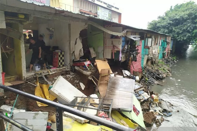 Tiga bangunan rumah toko (ruko) di bantaran saluran air di Pulo Gadung, Jakarta Timur, ambles akibat longsor saat hujan deras mengguyur kawasan itu, Jumat (24/1/2020) siang.