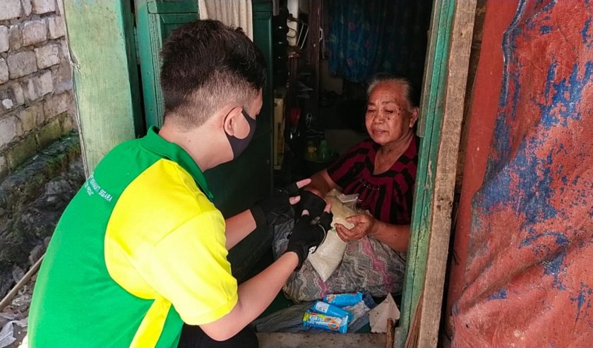 Komunitas Tolong Menolong (KTM) dan PT. Indramukti Segara membagikan “Paket Corona” yang berisi paket sembako kepada 100 lansia di Kolong Jembatan Tol Tambak Asri Surabaya, Minggu (12/4/2020).