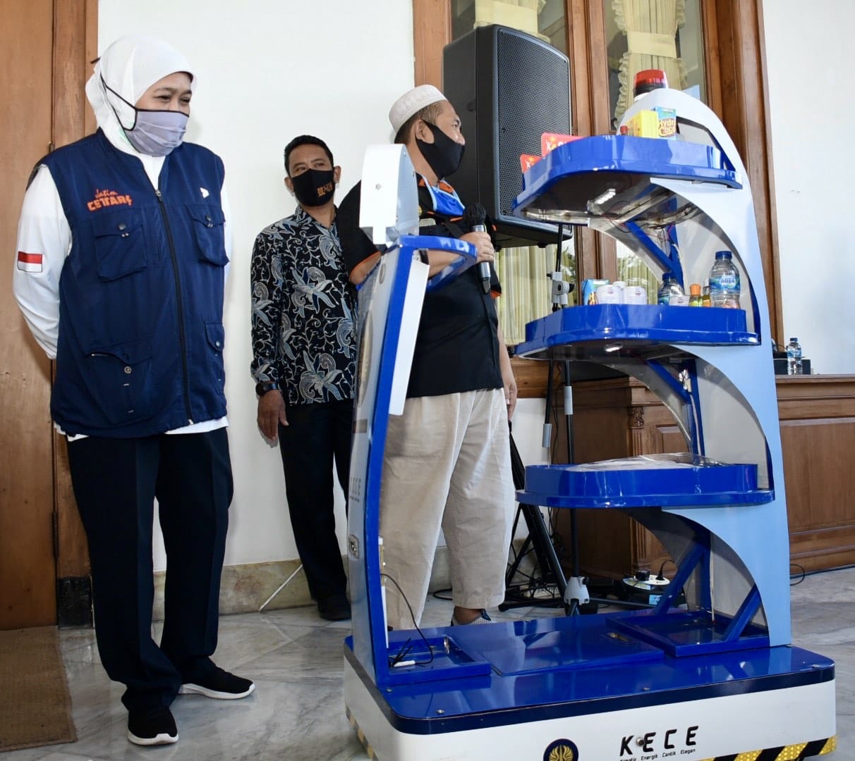 Prof. Dr. Nurhasan yang secara langsung menyerahkan dua unit robot KECE ini kepada Khofifah di halaman Gedung Negara Grahadi Surabaya. Khofifah yakin, robot itu kan berkontribusi signifikan. Salah satu kontribusi keberadaan robot itu dalam penanganan pasien Covid-19 di RSDL Indrapura adalah efisiensi penggunaan Alat Perlindungan Diri (APD) tenaga kesehatan yang memang tidak bisa dibilang melimpah.