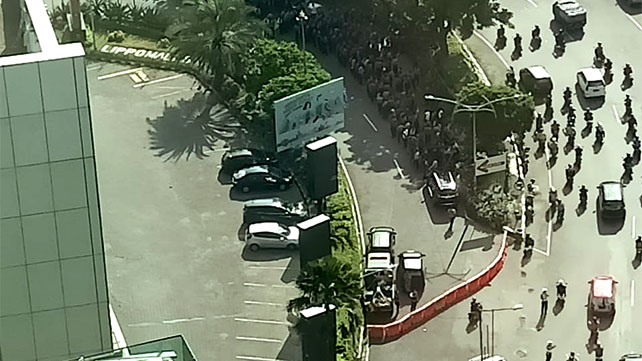 Ratusan personel Polrestabes Surabaya apel di depan Mal Cito, di Frontage Road (FR) Barat setelah Bundaran Waru. Akses masuk ke FR Barat tempat apel ini ditutup. Kendaraan harus lewat jalur cepat Ahmad Yani dulu, kemudian kebali ke FR Barat setelah Cito.