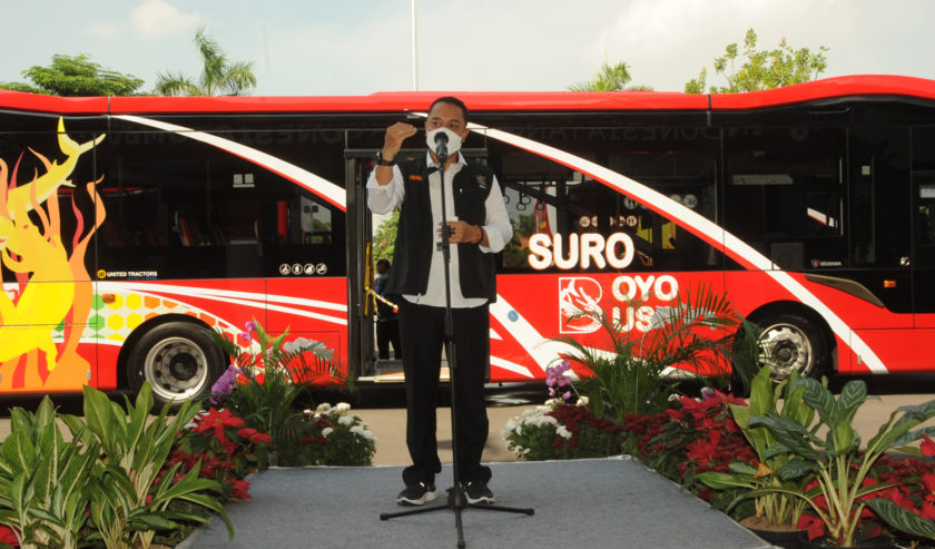 Armada dan rute baru Suroboyo Bus diluncurkan di Balai Kota Surabaya, Senin (23/8/2021). Peluncuran armada, rute, dan sistem pembayaran baru itu ditandai dengan pemotongan untaian melati di pintu masuk Suroboyo Bus yang dilakukan oleh Eri Cahyadi Wali Kota Surabaya, dan juga pemecahan kendi oleh Kapolrestabes Surabaya.