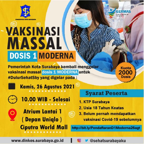 Sementara untuk pelaksanaan vaksinasi Moderna dosis ketiga yang berfungsi sebagai immune booster bagi tenaga SDMK, masih terus dilakukan. Pemkot Surabaya menggelar kembali vaksinasi untuk SDMK mulai tanggal 25 – 28 Agustus 2021 di Atlas Sport Center Surabaya.