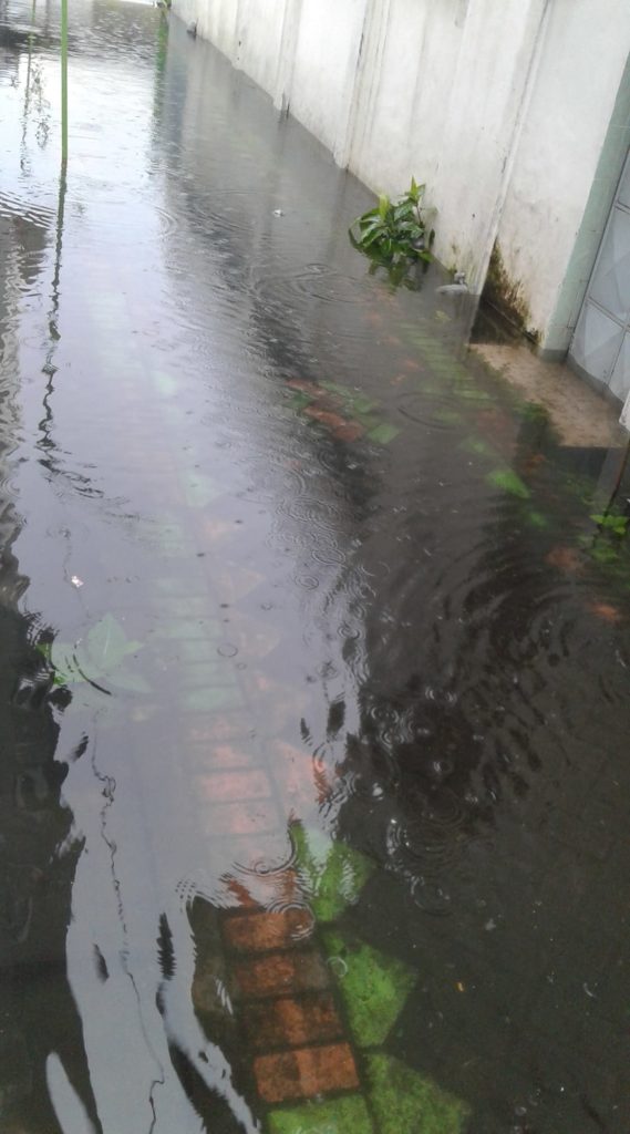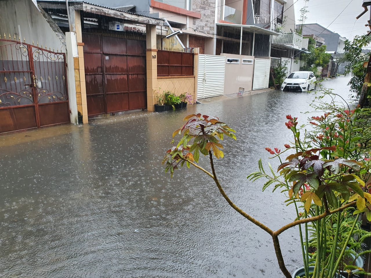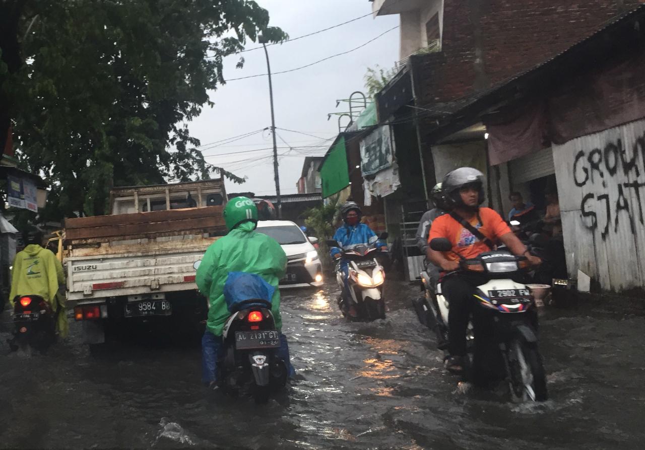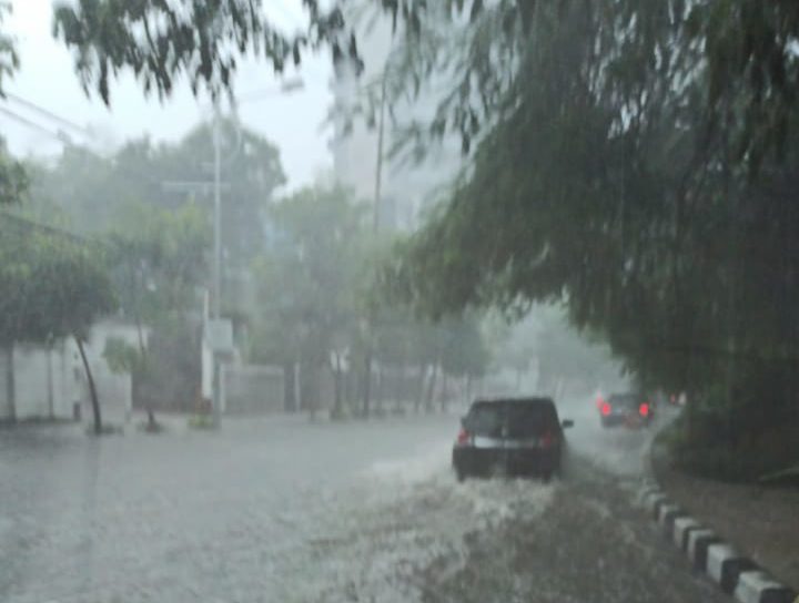 “Banjir di Manukan Tama ke arah Jelindro, cukup dalam setengah ban Innova, mobil antre juga melambat di belokan,” tulis Christian Stepanus Yulianto.