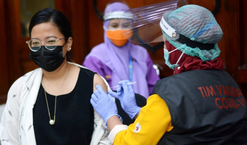 Deedee Dinata, penyiar radio di Surabaya mengikuti vaksinasi massal untuk wartawan dan awak media yang digelar PWI Jatim dan Pemprov Jatim, Sabtu (27/2/2021). Foto : Anton suarasurabaya.net