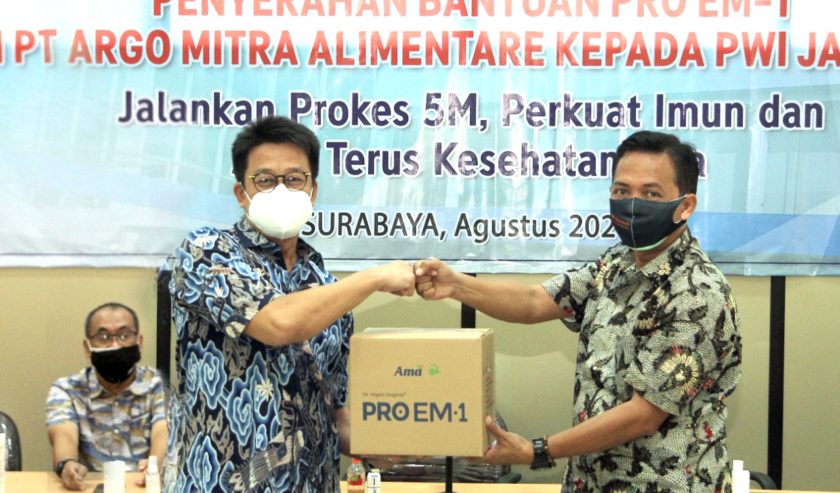 Persatuan Wartawan Indonesia (PWI) Jawa Timur mendapat bantuan sebanyak 168 botol Proem-1 dari produsen probiotik cair PT Agro Mitra Alimentare (AMA) untuk membantu penanganan Covid-19, khususnya di kalangan jurnalis.
