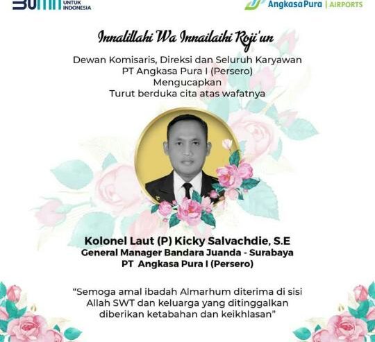 Kabar duka datang dari Bandara Juanda Surabaya. Kolonel Laut (P) Kicky Salvachdie General Manager PT Angkasa Pura I Bandara Juanda meninggal, Sabtu (24/7/2021) sore pukul 17.30 WIB.