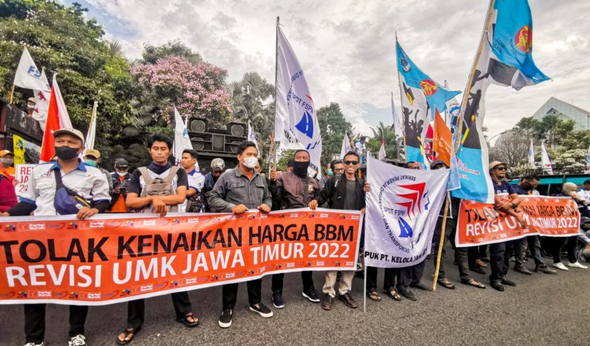 Aksi yang berlangsung sejak pukul 12.00 WIB itu menggaungkan tiga tuntutan, yakni menolak kenaikan harga Bahan Bakar Minyak (BBM), mendesak kelayakan upah buruh, dan mendesak agar Dinas Tenaga Kerja dan Transmigrasi (Disnakertrans) Provinsi Jatim memperbaiki kinerjanya.