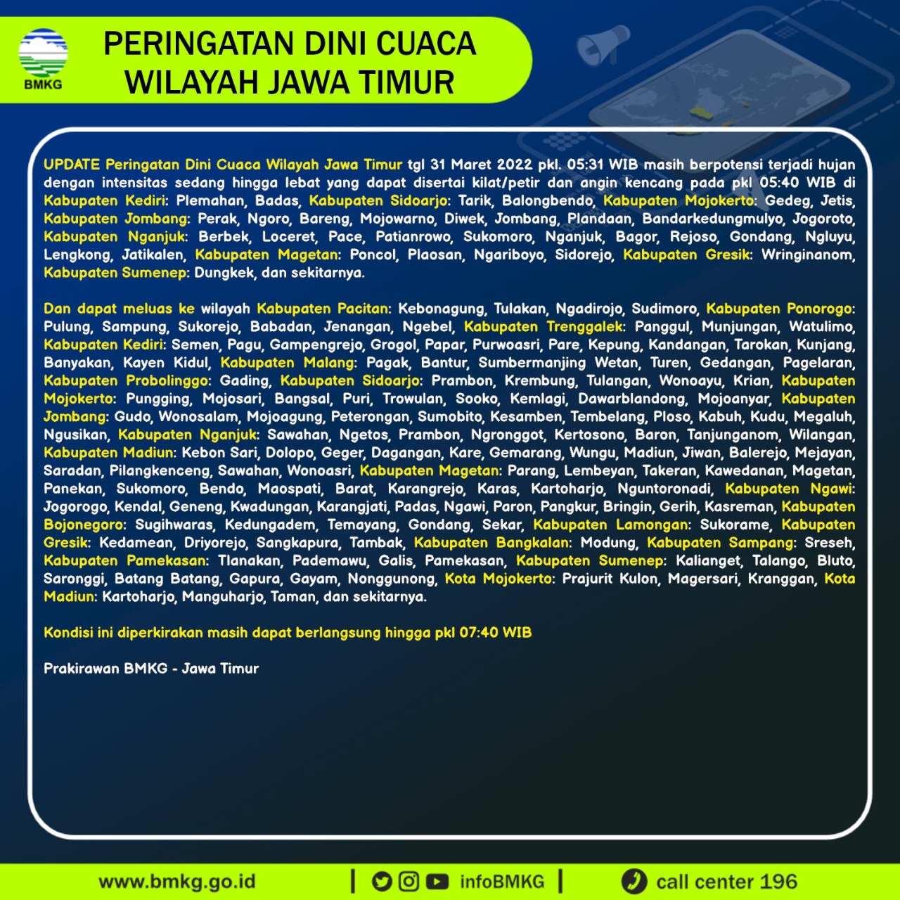 Dalam informasi tertulisnya, hujan dengan intensitas sedang hingga lebat, disertai petir dan angin kencang sesaat, diprakirakan terjadi di sejumlah wilayah Jawa Timur, antara lain: