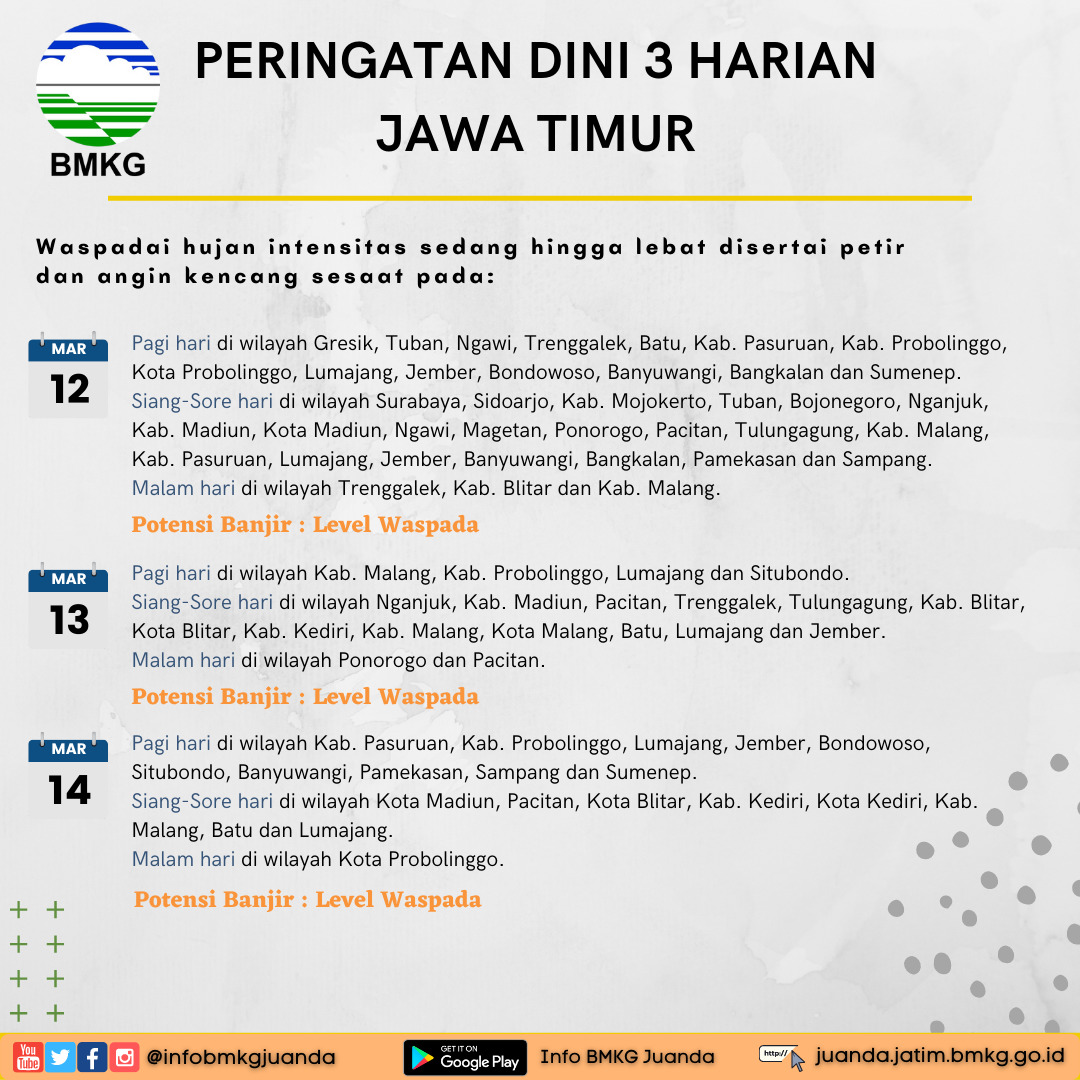 Badan Meteorologi, Klimatologi dan Geofisika (BMKG) mengeluarkan peringatan dini tiga harian untuk wilayah Jawa Timur, pada Sabtu (12/3/2022).
