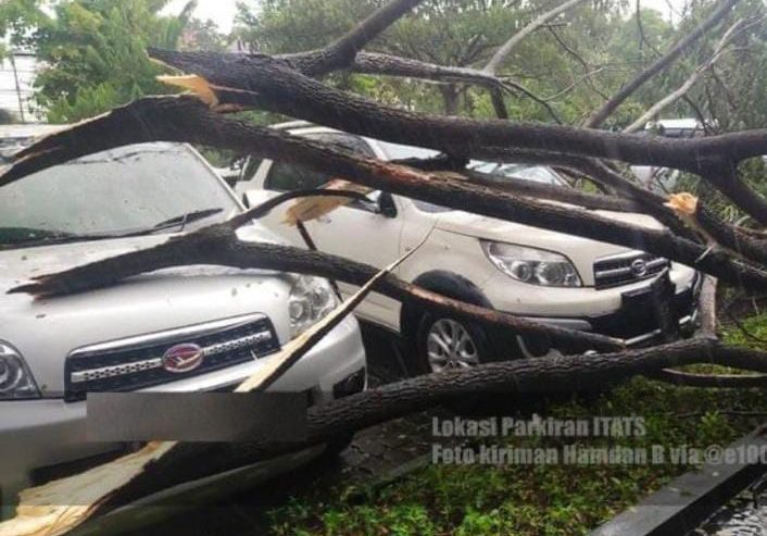 Belasan pohon tumbang juga dilaporkan netter via twitter @e100ss. Hamdan, mengirimkan foto kejadian dua mobil tertimpa pohon tumbang di parkiran ITATS.