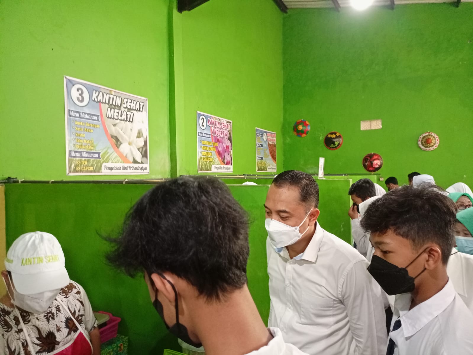 Eri Cahyadi Wali Kota Surabaya meninjau langsung proses pembayaran menggunakan KIA di kantin sekolah SMPN 42 Surabaya, Selasa (14/6/2022). Foto: Meilita suarasurabaya.net
