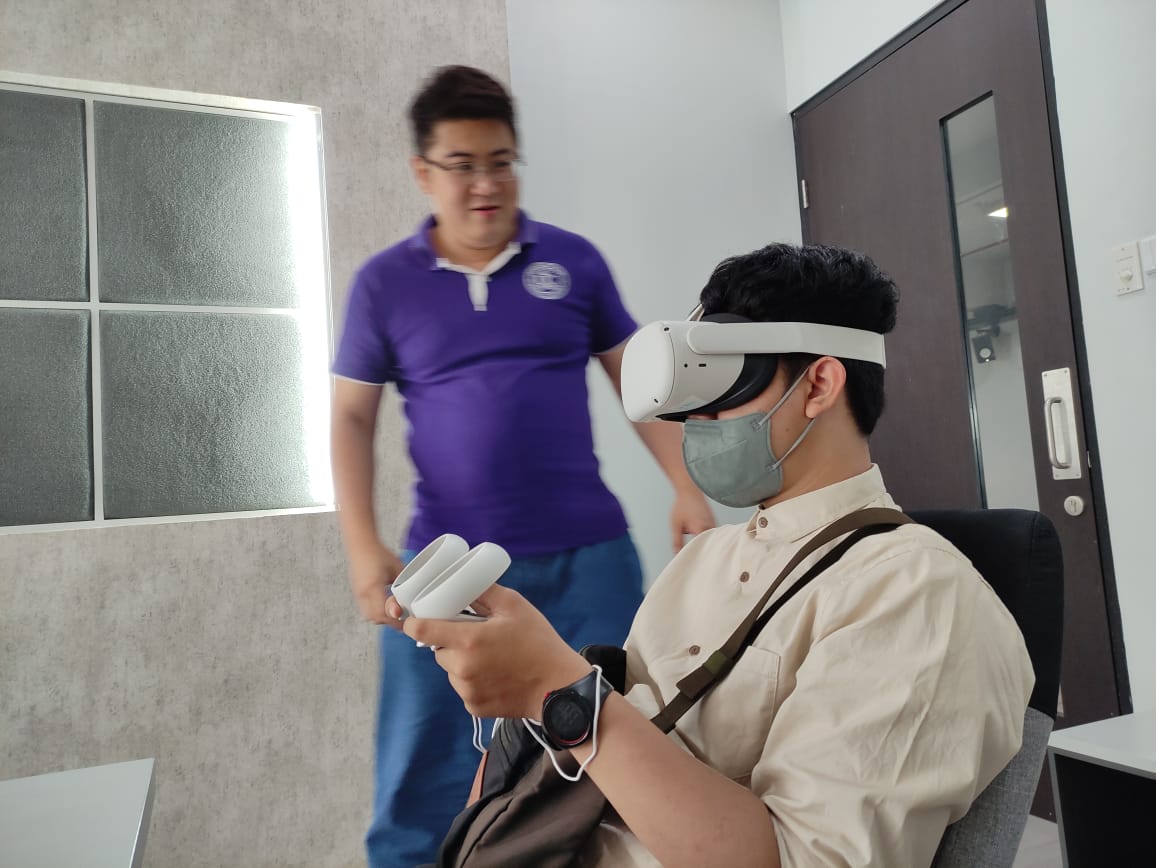 Wartawan saat menjajal berkeliling di ruang pameran virtual karya mahasiswa UC menggunakan metaverse, Kamis (9/6/2022) Foto: Retha suarasurabaya.net
