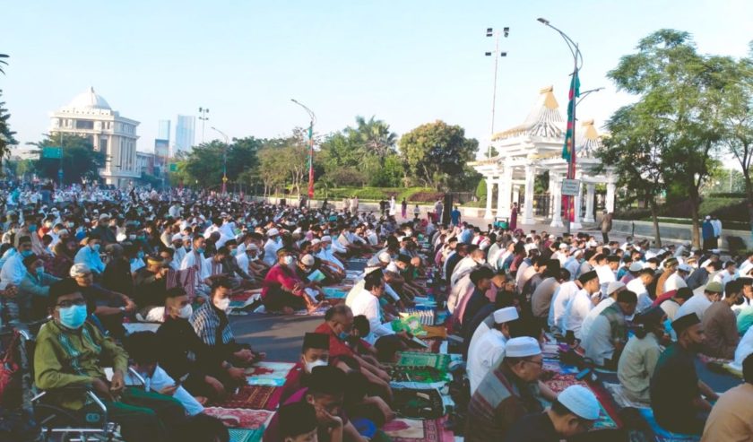 Salat Idul Fitri 1443/2022 di sekitar Tugu Pahlawan Surabaya. Foto: PWMU