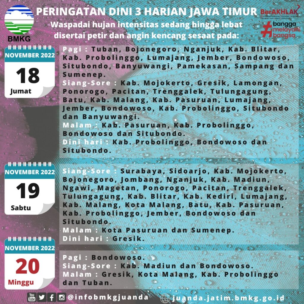 Sementara Badan Meteorologi, Klimatologi, dan Geofisika (BMKG) Juanda memprakirakan cuaca di sekitar wilayah Jawa Timur (Jatim) dilanda hujan pada Jumat (18/11/2022).