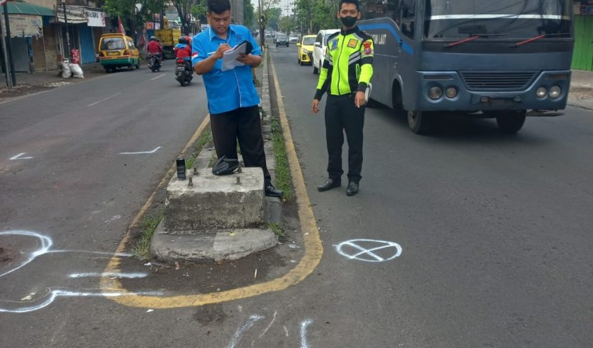 Petugas di lokasi kecelakaan sedang mengumpulkan informasi dan memberikan garis pendanda di Simpang Empat Gedangan, Sidoarjo, Jawa Timur, Minggu (2/10/2022). Foto: Iptu Ony Kanit Gakum Polresta Sidoarjo