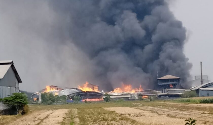 Kebakaran pabrik tisu di Ngoro, Mojokerto, Kamis (13/10/2023) pagi. Foto: Ferdinandus Wahyu pendengar Radio Suara Surabaya via WhatsApp Suara Surabaya.