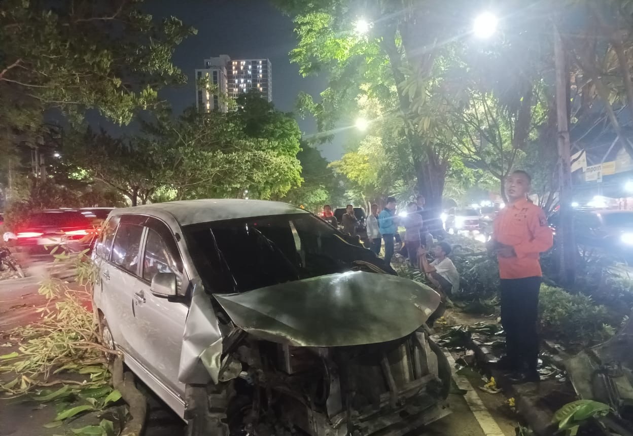 Sebuah mobil Xenia yang melaju di Jalan Ahmad Yani Surabaya, tiba-tiba hilang kendali dan oleng melewati median jalan hingga menabrak mobil lain dari arah berlawanan pada, Rabu (1/11/2023) malam.
