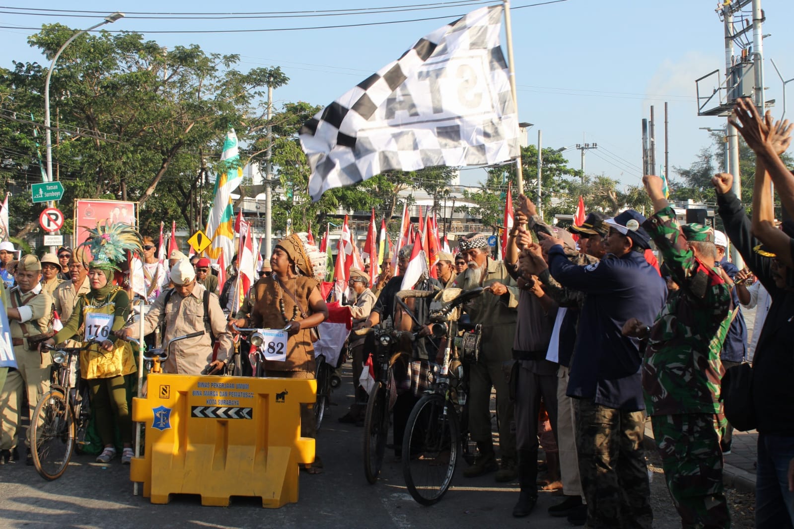 Dimulainya kegiatan Jambore Sepeda Tua Nasional dengan pengangkatan bendera start di Sentra Ikan Bulak Surabaya, Minggu (20/8/2023). Foto: Frans magang suarasurabaya.net