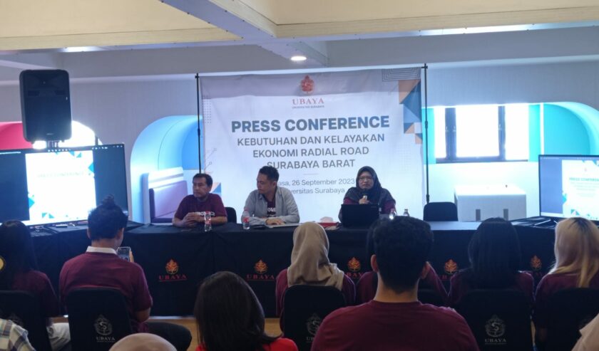 Idfi Setyaningrum Dosen Prodi Ekonomi Pembangunan Ubaya (kanan) didampingi Aluisius Hery Pratono Ketua Jurusan Ilmu Ekonomi Ubaya (tengah) dan Bambang Budiarto Pengamat Ekonomi Ubaya saat konferensi pers Kebutuhan dan Kelayakan Ekonomi Radial Road Surabaya Barat, Selasa (26/9/2023). Foto: Risky suarasurabaya.net Idfi Setyaningrum Dosen Prodi Ekonomi Pembangunan Ubaya (kanan) didampingi Aluisius Hery Pratono Ketua Jurusan Ilmu Ekonomi Ubaya (tengah) dan Bambang Budiarto Pengamat Ekonomi Ubaya saat konferensi pers Kebutuhan dan Kelayakan Ekonomi Radial Road Surabaya Barat, Selasa (26/9/2023). Foto: Risky suarasurabaya.net
