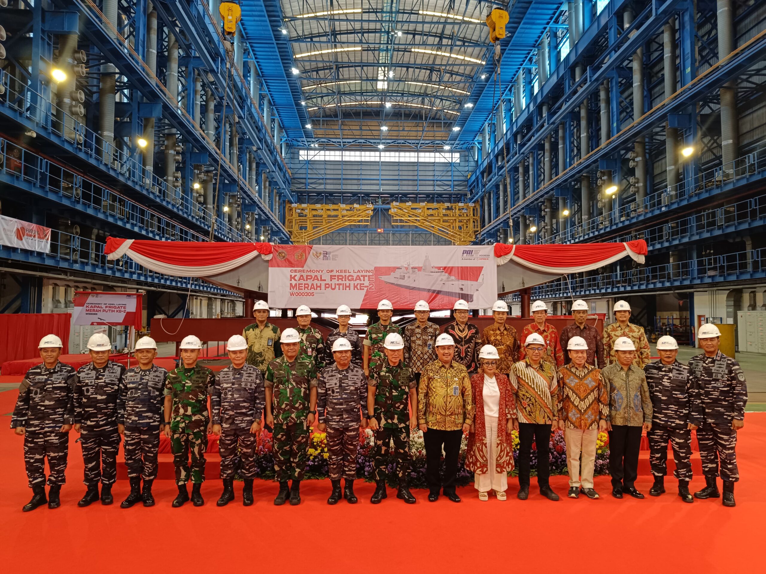 PT PAL Indonesia bersama Kementerian Pertahanan (Kemhan) RI resmi melaksanakan keel laying atau peletakan lunas kapal Fregat Merah Putih ke-2 di Gedung Divisi Kapal Selam, PT PAL Indonesia, Surabaya, pada Jumat (15/11/2024).