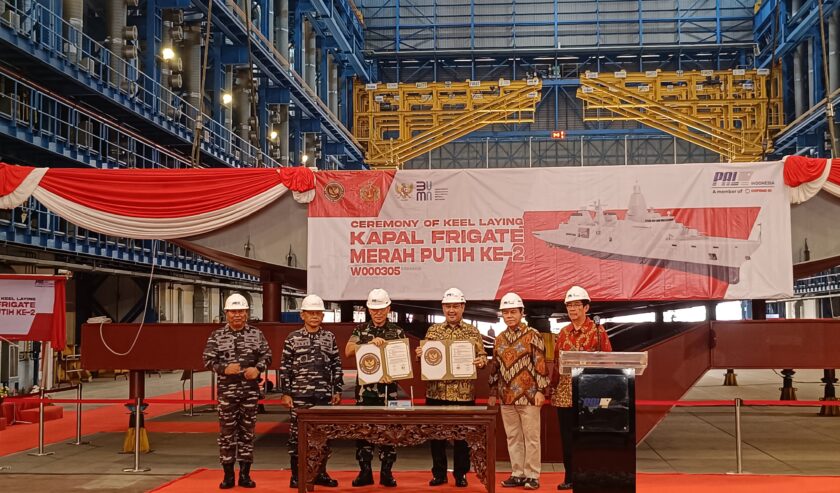 PT PAL Indonesia bersama Kementerian Pertahanan (Kemhan) RI resmi melaksanakan keel laying atau peletakan lunas kapal Fregat Merah Putih ke-2 di Gedung Divisi Kapal Selam, PT PAL Indonesia, Surabaya, pada Jumat (15/11/2024).